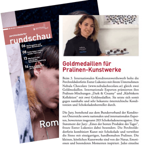 Gleich zwei Goldmedaillen holte Eszter Lukenics mit ihrem Perchtoldsdorfer Unternehmen Nebula Chocolate beim 3. Internationalen Konditorenwettbewerb. Die Jury bewertete insgesamt 203 Schokoladenerzeugnisse, Nebula Chocolate ist das einzige Unternehmen in Niederösterreich, das mit 2 Goldmedaillen ausgezeichnet wurde.