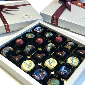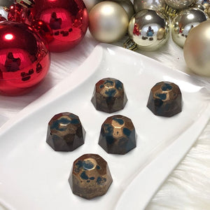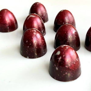 Dunkle Ganache schillernd wie festlicher Weihnachtsschmuck gefüllt mit Marzipan.